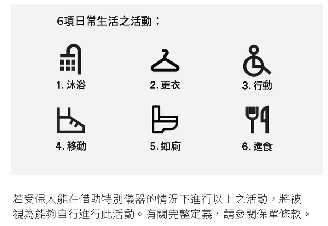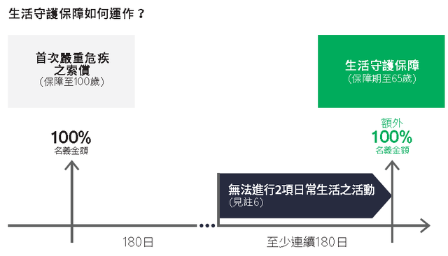 1)许多严重疾病都会对个人的健康造成长期的影响,削弱自理和日常生活的能力。疾病导致的残疾往往需要长期的护理,为了缓解由此产生的经济压力,该产品提供了一次性的额外财务支持,作为生活守护保障,保障期限至65岁。2)在首次获得严重疾病赔偿后至少180天,如果受保人连续180天或更长的时间内无法完成上述6项日常生活活动中的其中2项,并且在整个过程中需要他人的帮助(称为“残疾”),我们将提供相当于保额100%的额外保障。