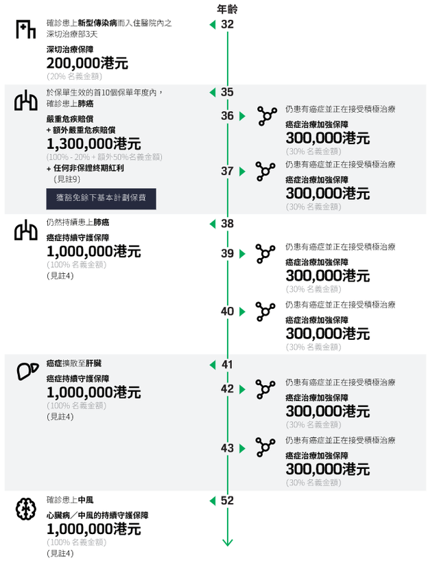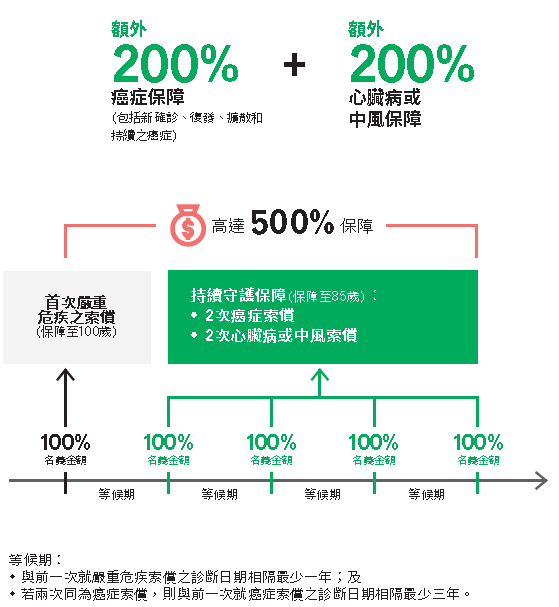 2. 在保单前10个年度内,若患上重大疾病,将获得额外50%的保障。