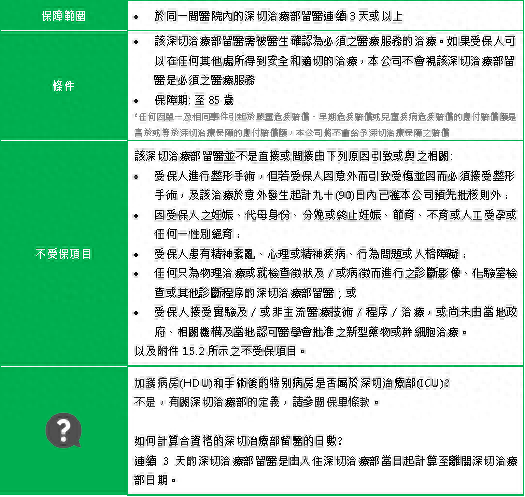 3. 深切治疗保障——在同一医院内的重症监护室(ICU)连续住院3天或以上,可预支赔偿额的20%。