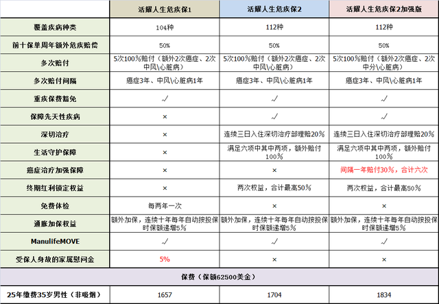关于这三个保险计划的对比图,您可以查看附件,其中详细列出了各个计划的升级变化。此外,您还可以关注保费问题。以35岁非吸烟男性25年缴费62500美金保额为例,「活耀人生危疾保」的保费为1657美金一年,「活耀人生危疾保2」相较于「活耀人生危疾保」上涨了约5%,而「活耀人生危疾保2加强版」相较于「活耀人生危疾保2」上涨了约10%。这些涨幅相对较小,可以说是非常合理的。