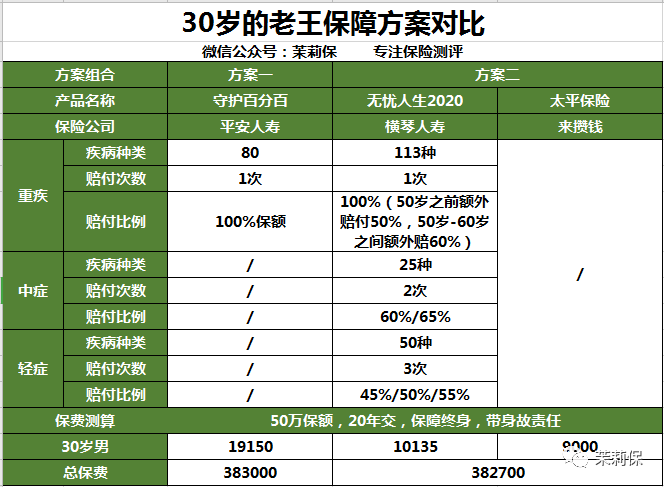 为了让大家更直观的了解,以30岁的老王为例,给他做了2种方案,方案一就是平安人寿的守护百分百,方案二是横琴人寿的无忧人生2020重疾险,太平保险的来攒钱。